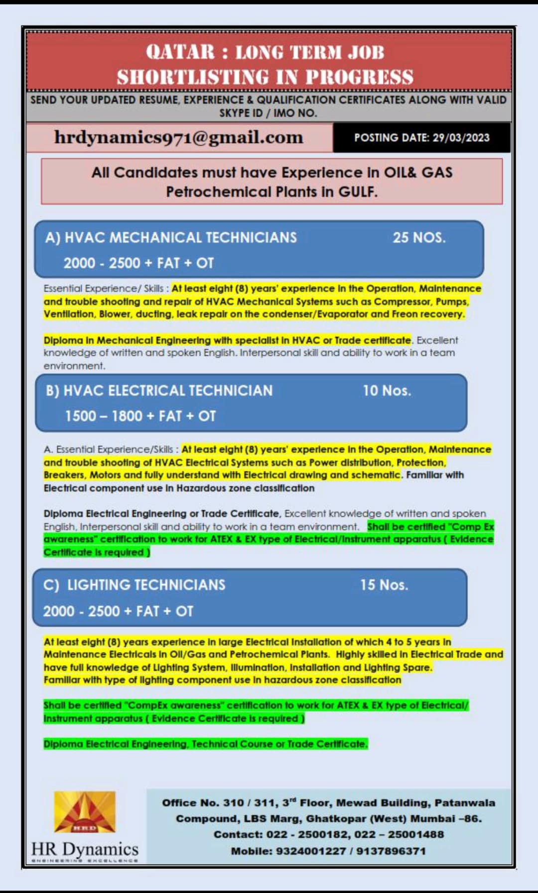 SEND YOUR UPDATED RESUME, EXPERIENCE & QUALIFICATION CERTIFICATES ALONG WITH VALID