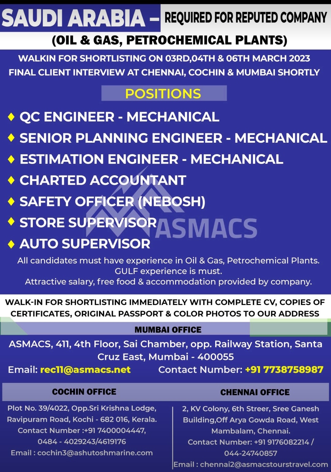 All candidates must have experience in Oil & Gas, Petrochemical Plants.
