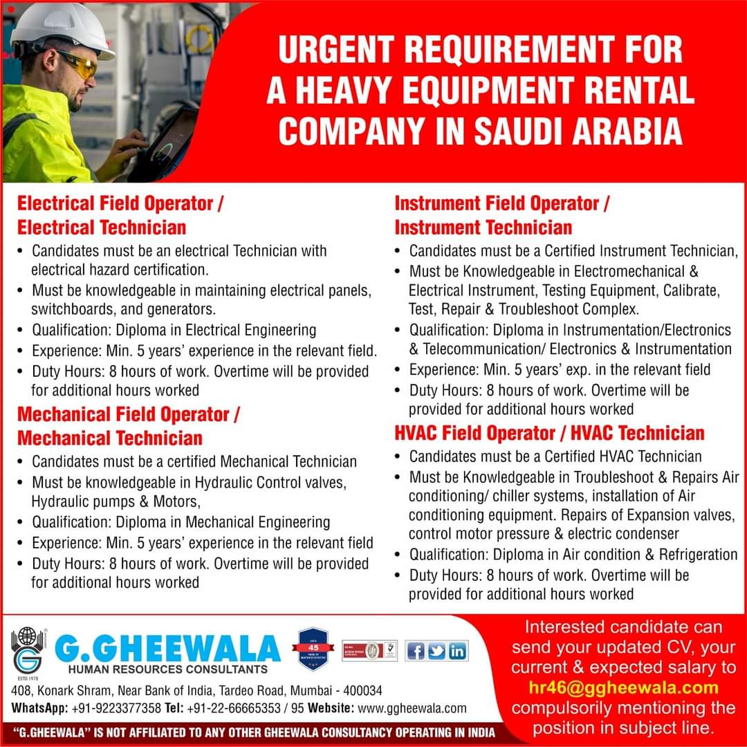 URGENT REQUIREMENT FOR A HEAVY EQUIPMENT RENTAL COMPANY IN SAUDI ARABIA