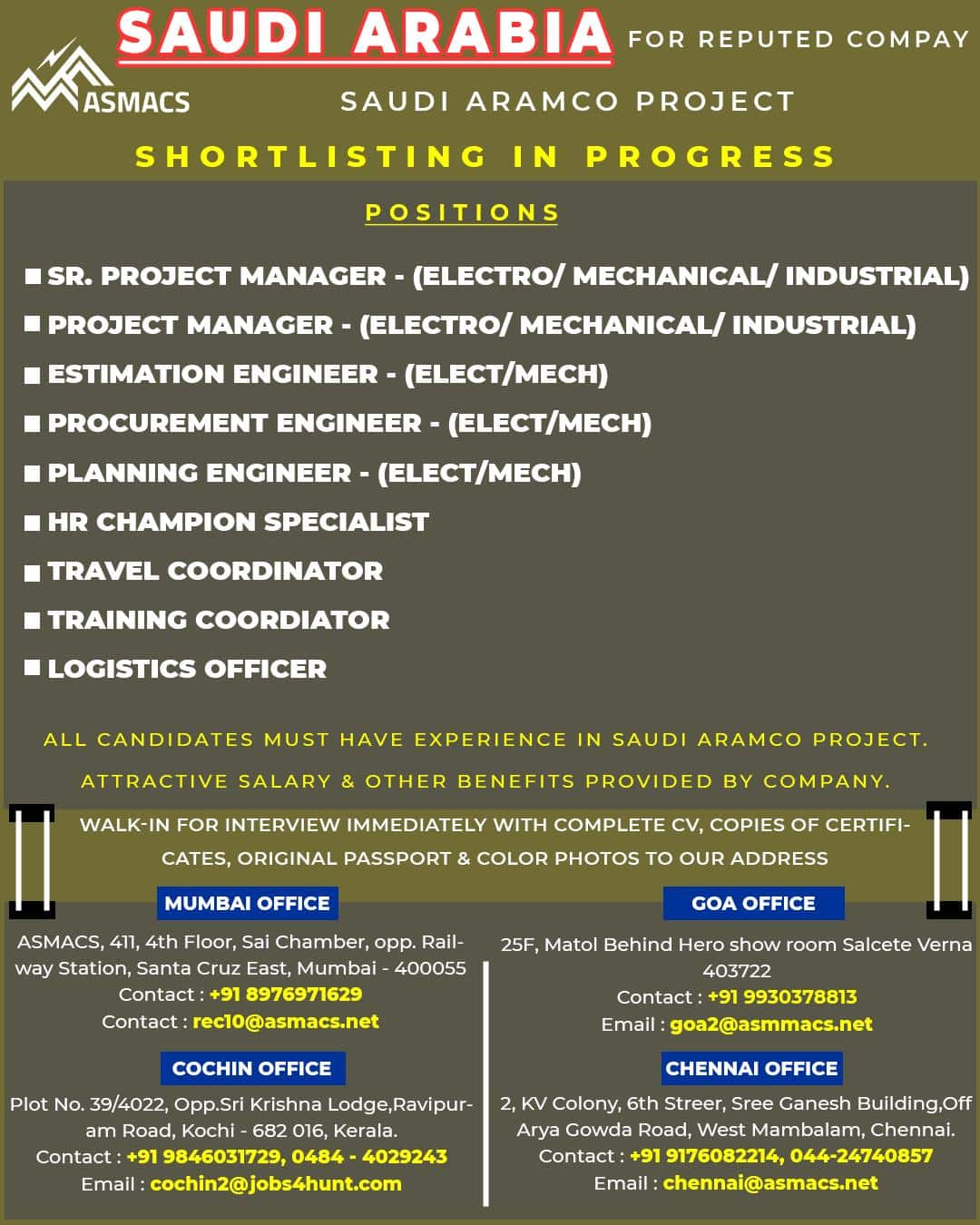 ALL CANDIDATES MUST HAVE EXPERIENCE IN SAUDI ARAMCO PROJECT.
