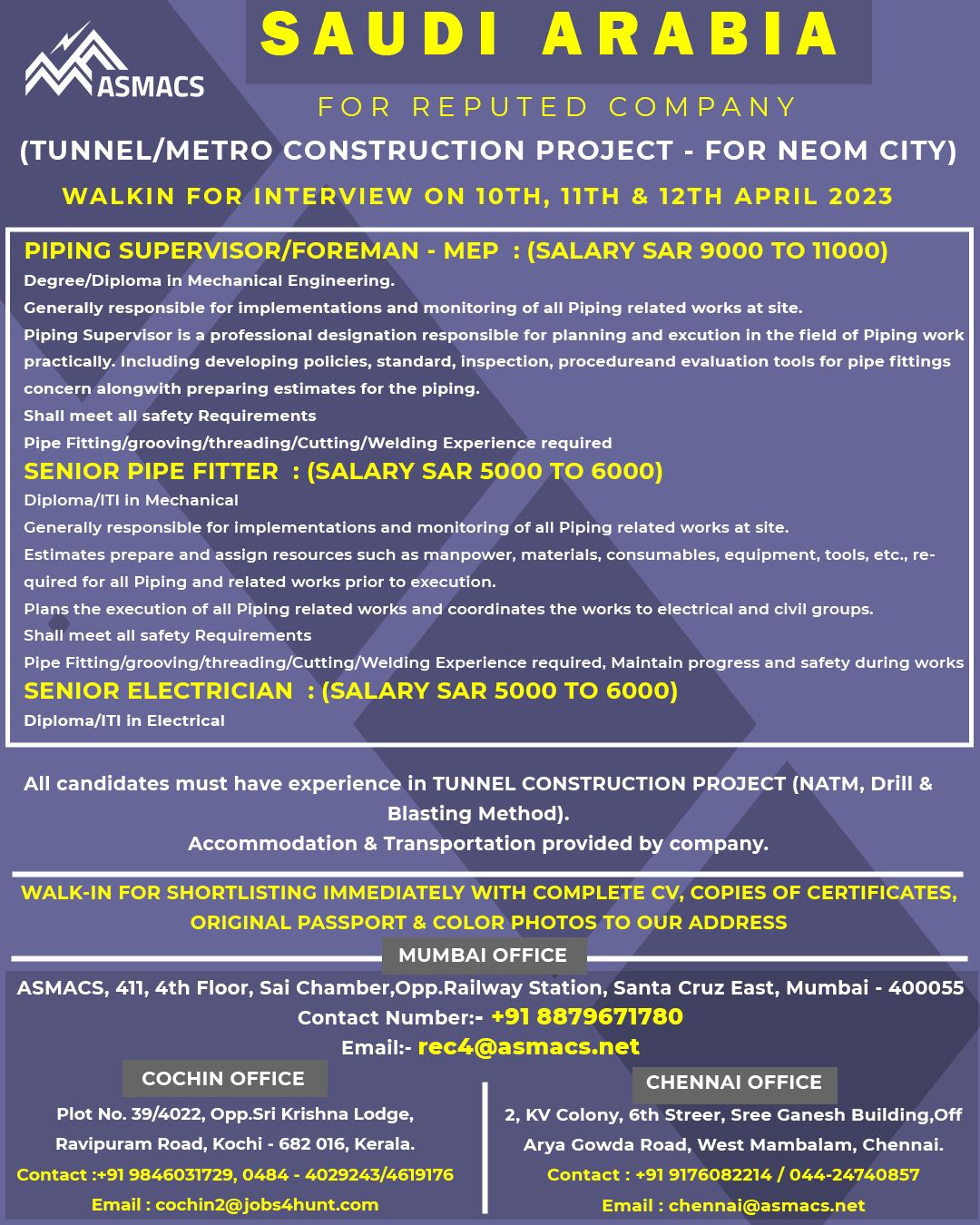 All candidates must have experience in TUNNEL CONSTRUCTION PROJECT (NATM, Drill & Blasting Method).