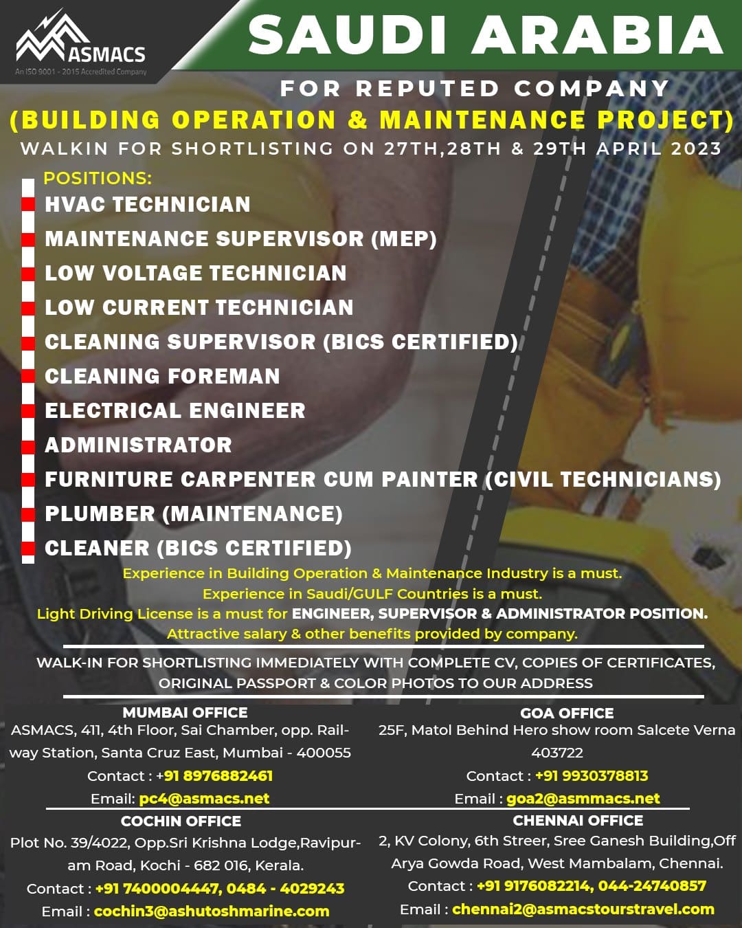 Light Driving License is a must for ENGINEER, SUPERVISOR & ADMINISTRATOR POSITION.