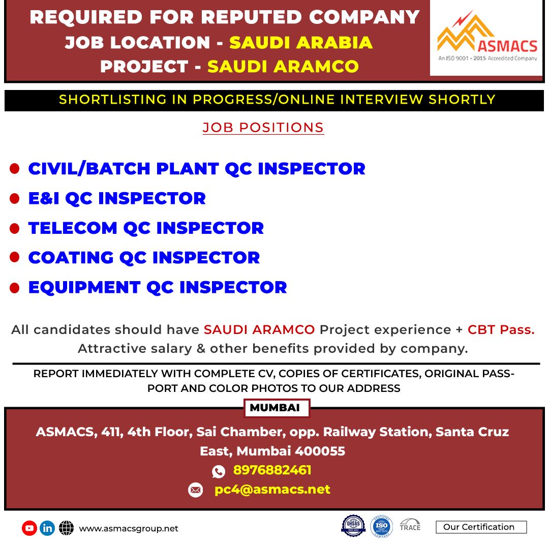 All candidates should have SAUDI ARAMCO Project experience + CBT Pass.
