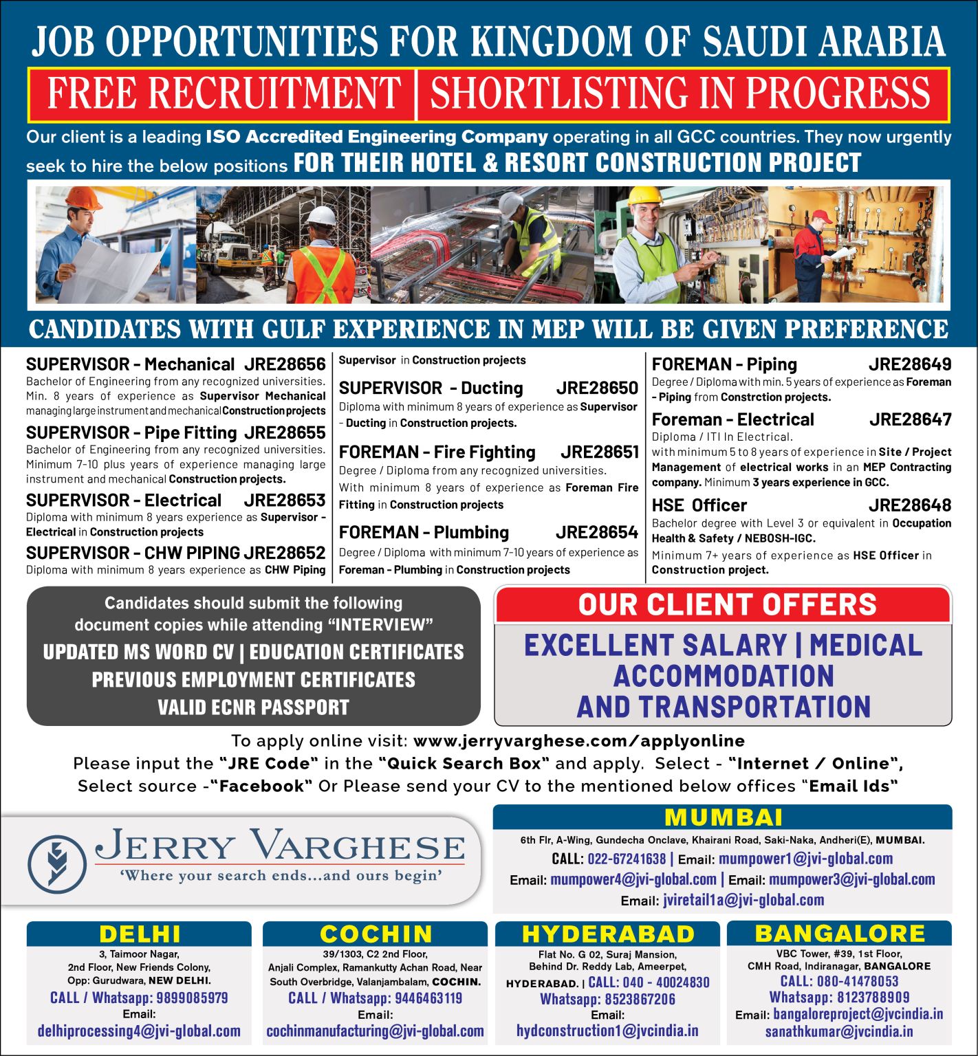 CANDIDATES WITH GULF EXPERIENCE IN MEP WILL BE GIVEN PREFERENCE