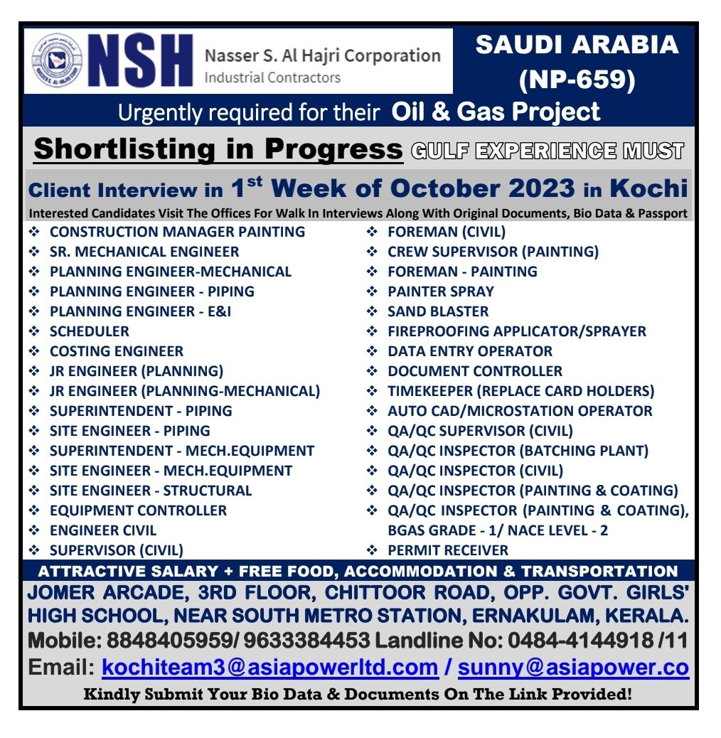 CONSTRUCTION MANAGER PAINTING /CREW SUPERVISOR (PAINTING) /QA/QC INSPECTOR (PAINTING & COATING) /QA/QC INSPECTOR (PAINTING & COATING) , BGAS GRADE – 1 / NACE LEVEL -2 /QA/QC INSPECTOR (BATCHING PLANT) /FOREMAN – PAINTING /PAINTER SPRAY / SAND BLASTER –https://lnkd.in/diJ3z8vW