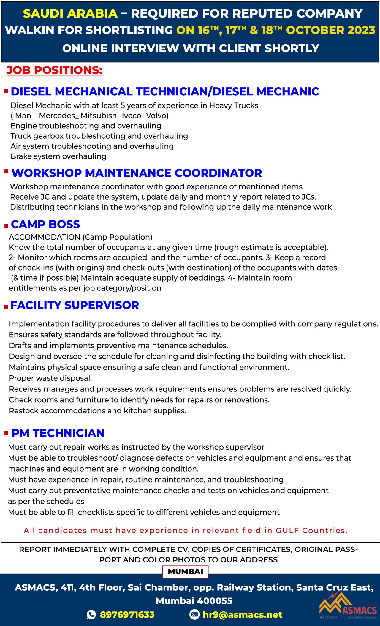 SAUDI ARABIA – REQUIRED FOR REPUTED COMPANY WALKIN FOR SHORTLISTING ON