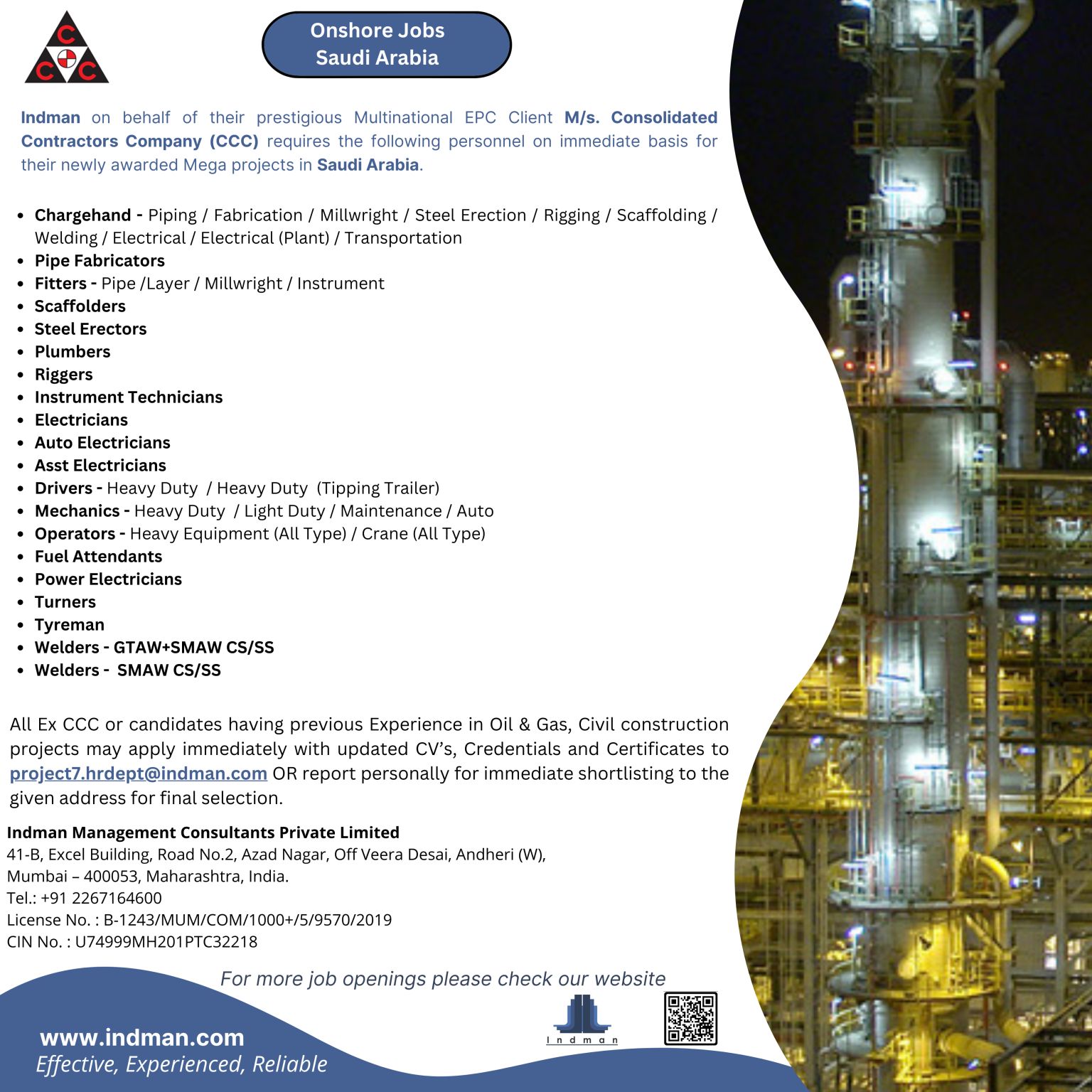 All Ex CCC or candidates having previous Experience in Oil & Gas, Civil construction projects may apply immediately with updated CV’s, Credentials and Certificates to project7.hrdept@indman.com OR report personally for immediate shortlisting to the given address for final selection.