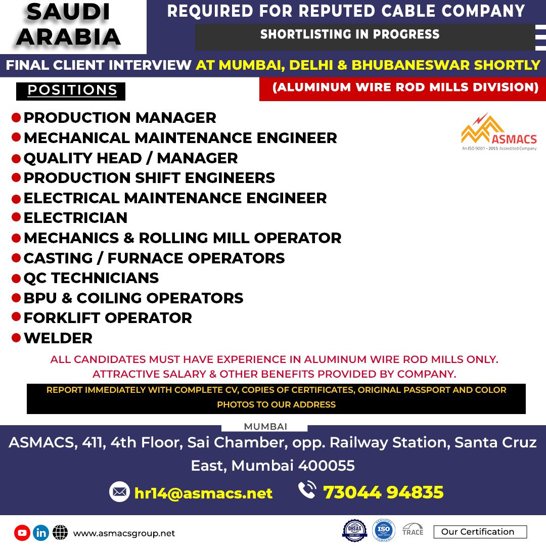 ALL CANDIDATES MUST HAVE EXPERIENCE IN ALUMINUM WIRE ROD MILLS ONLY.