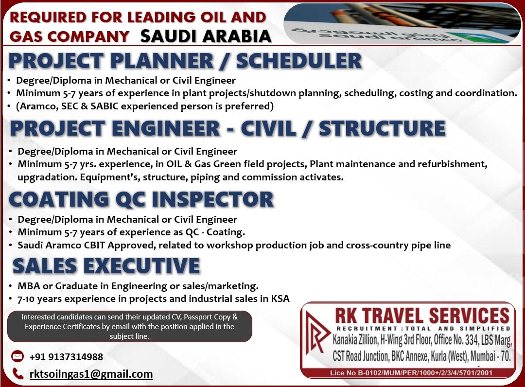 Minimum 5-7 yrs. experience, in OIL & Gas Green field projects, Plant maintenance and refurbishment,