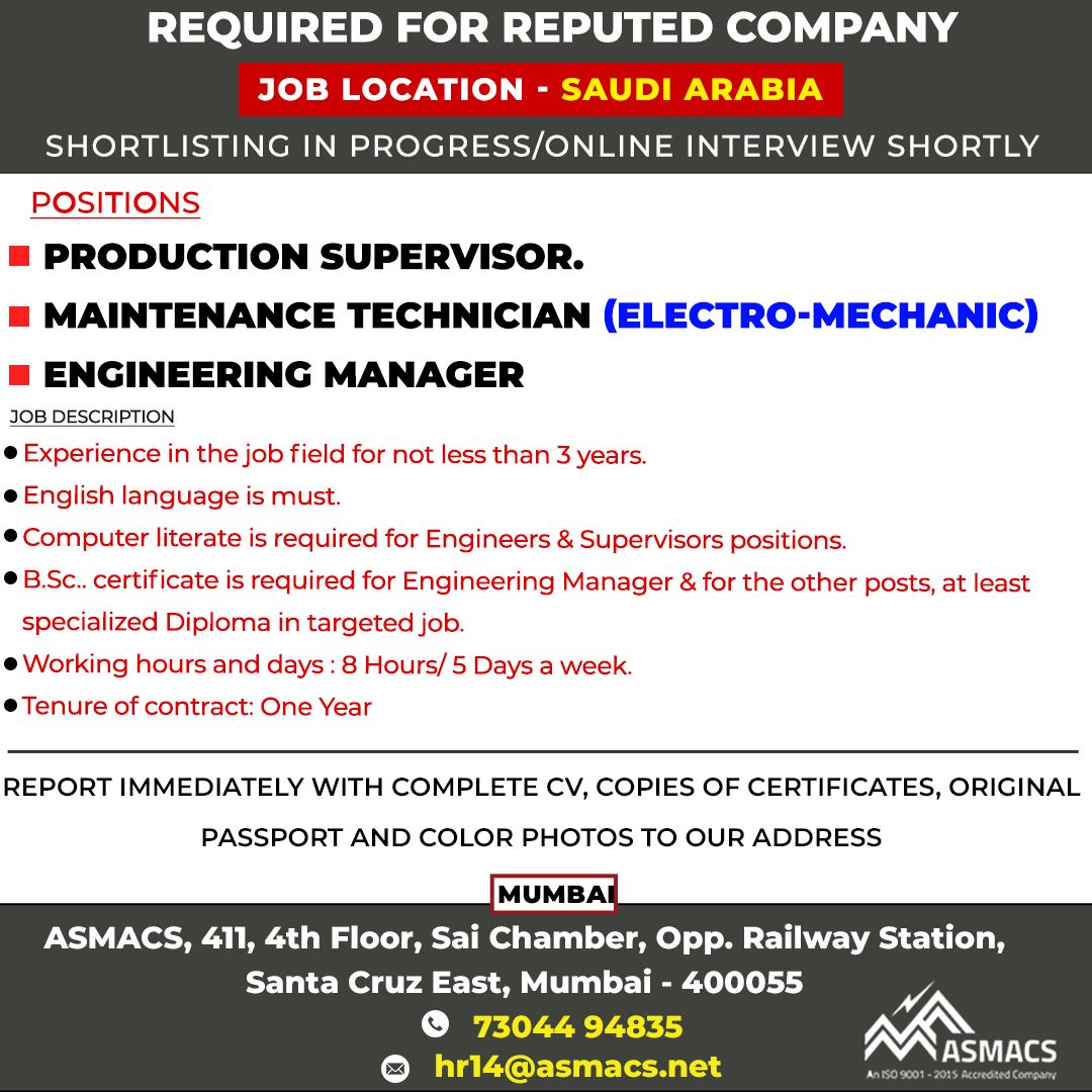 ● English language is must. - Computer literate is required for Engineers & Supervisors positions.