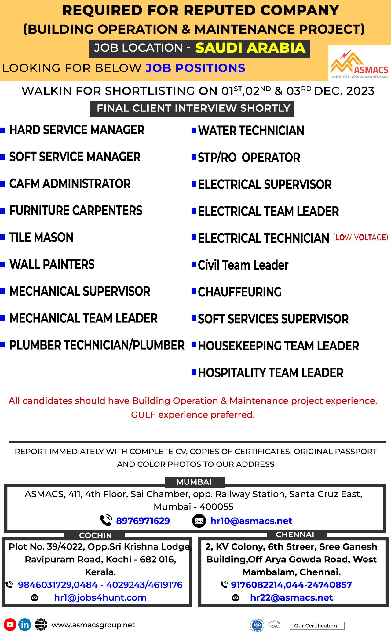 WALKIN FOR SHORTLISTING ON 01ST,02ND & 03RD DEC. 2023