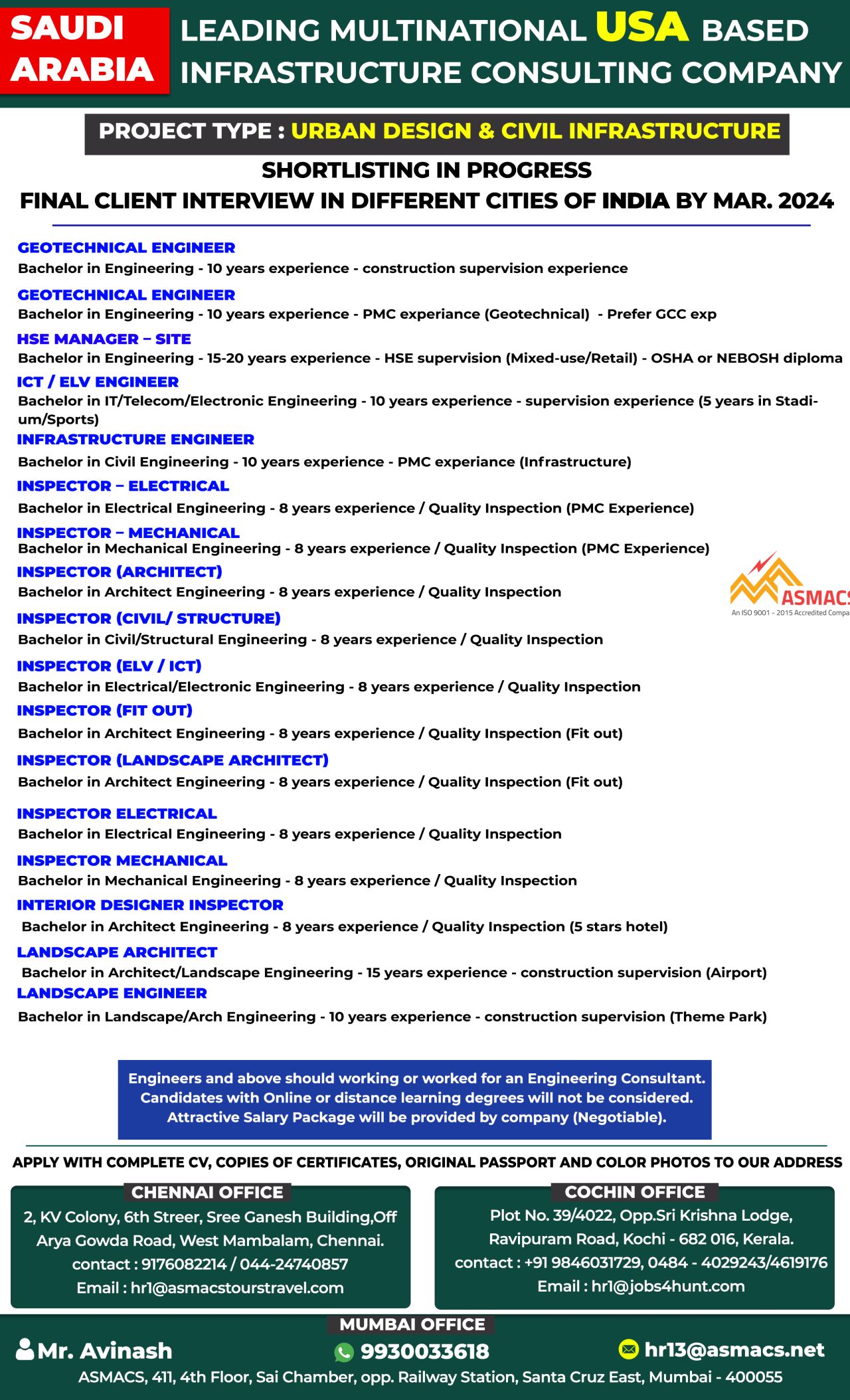 Bachelor in Engineering – 15-20 years experience – HSE supervision (Mixed-use/Retail) – OSHA or NEBOSH diploma