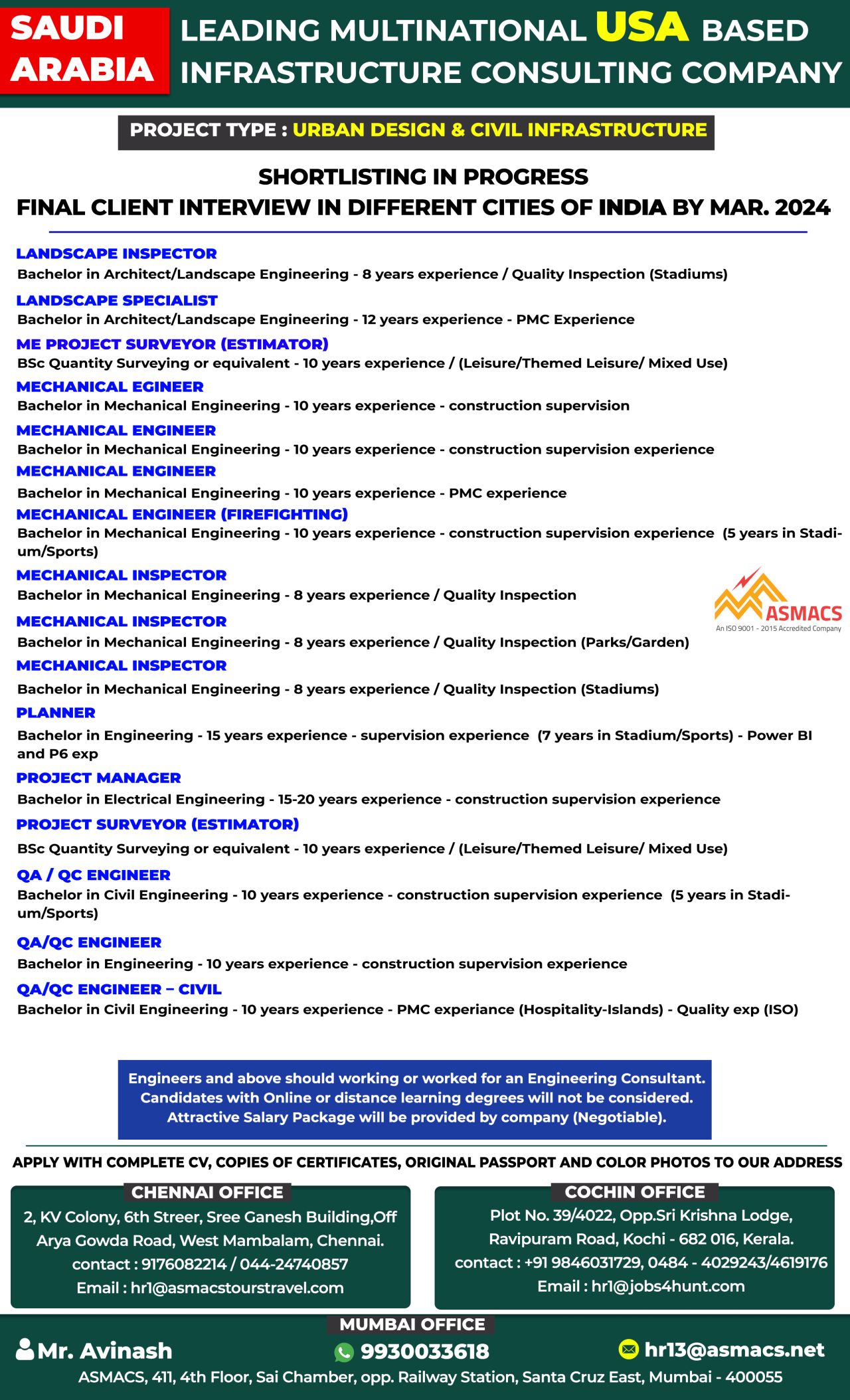 Bachelor in Mechanical Engineering – 8 years experience / Quality Inspection (Parks/Garden)