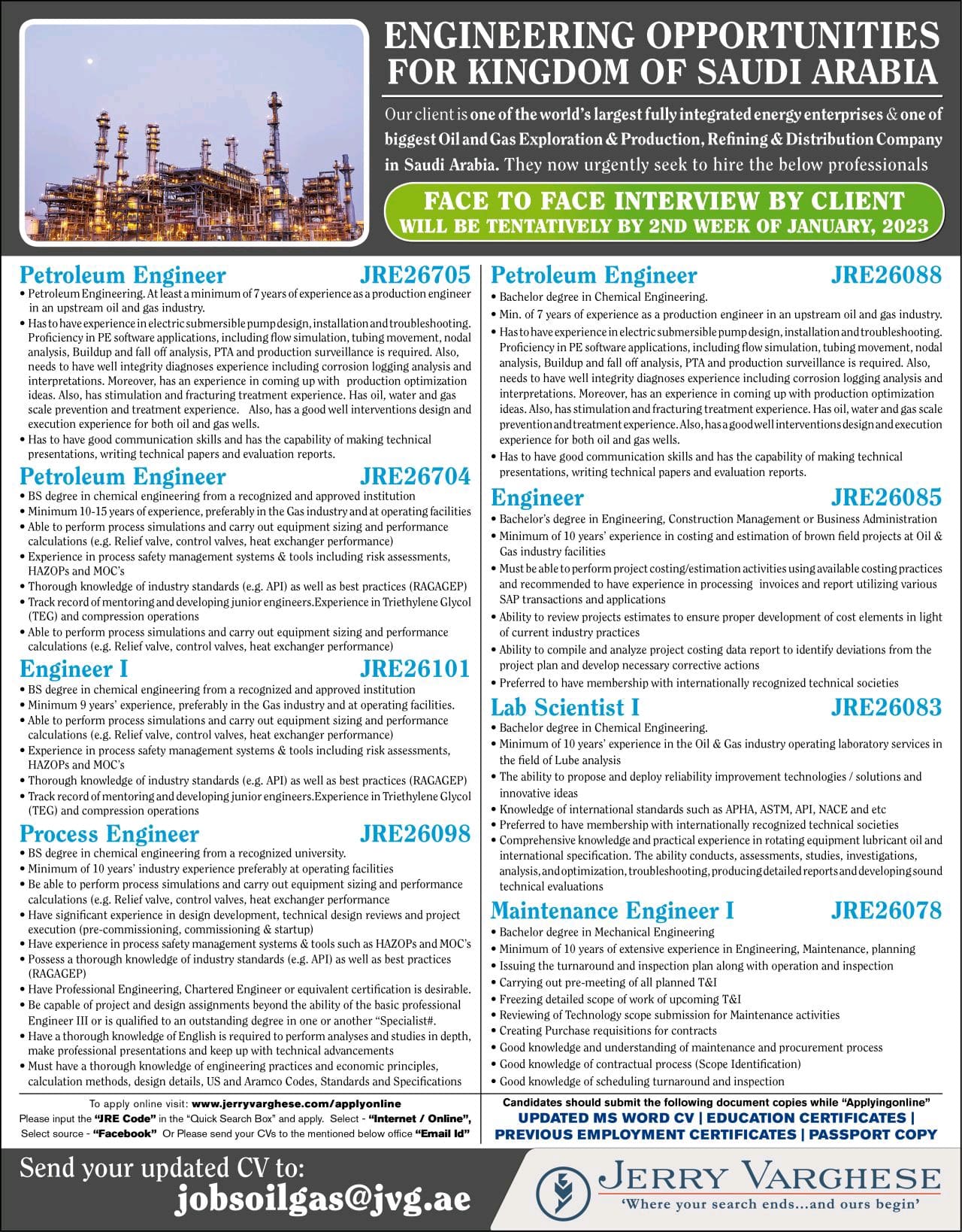 in Saudi Arabia. They now urgently seek to hire the below professionals