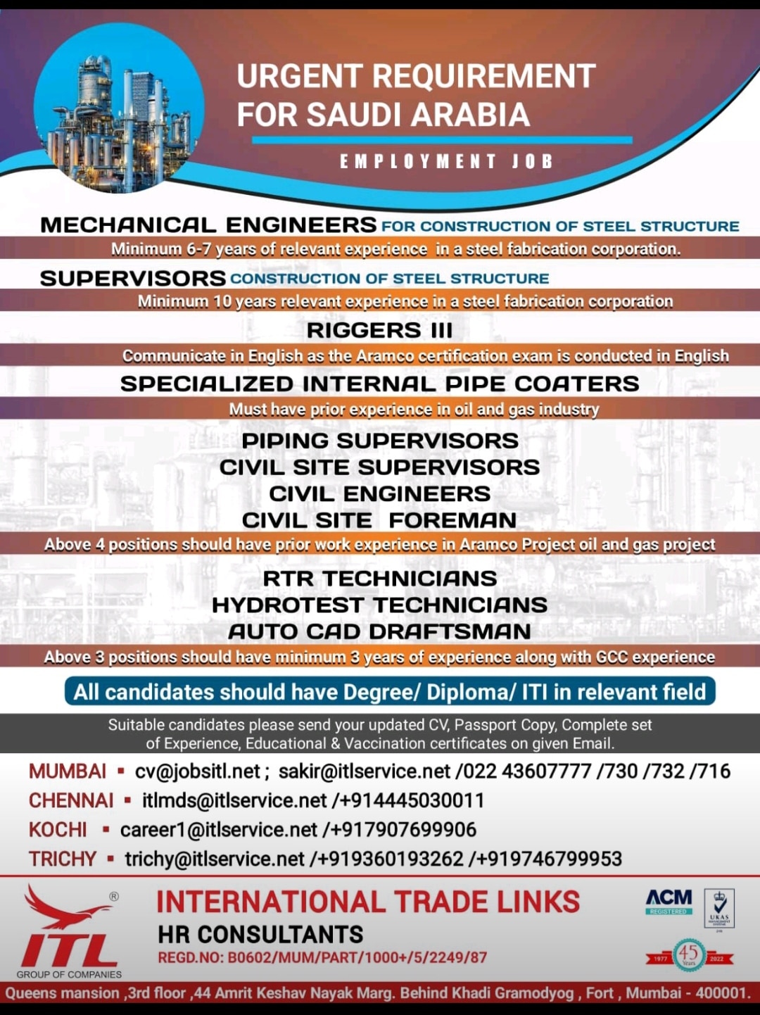 Above 4 positions should have prior work experience in Aramco Project oil and gas project