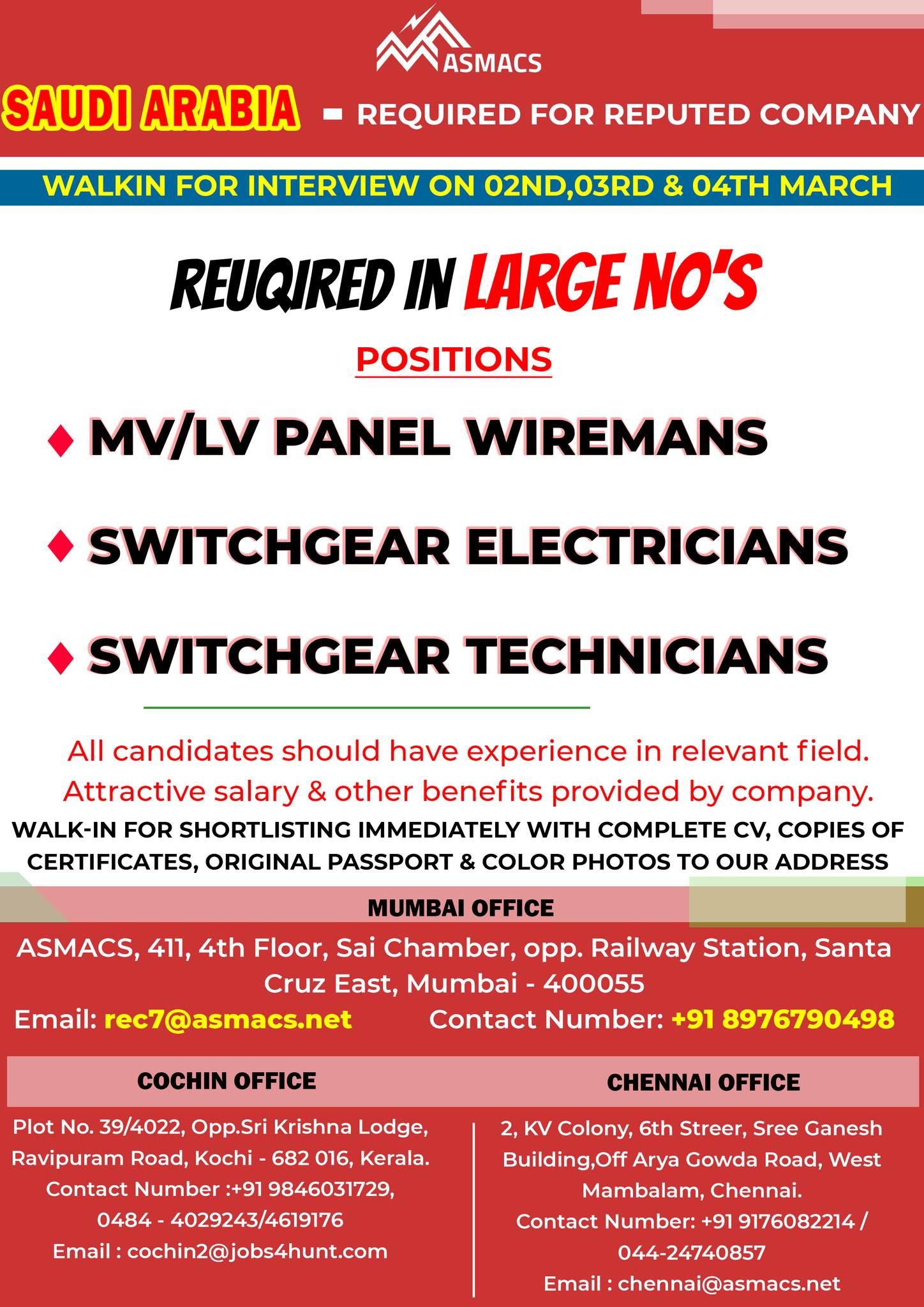 WALKIN FOR INTERVIEW ON 02ND,03RD & 04TH MARCH