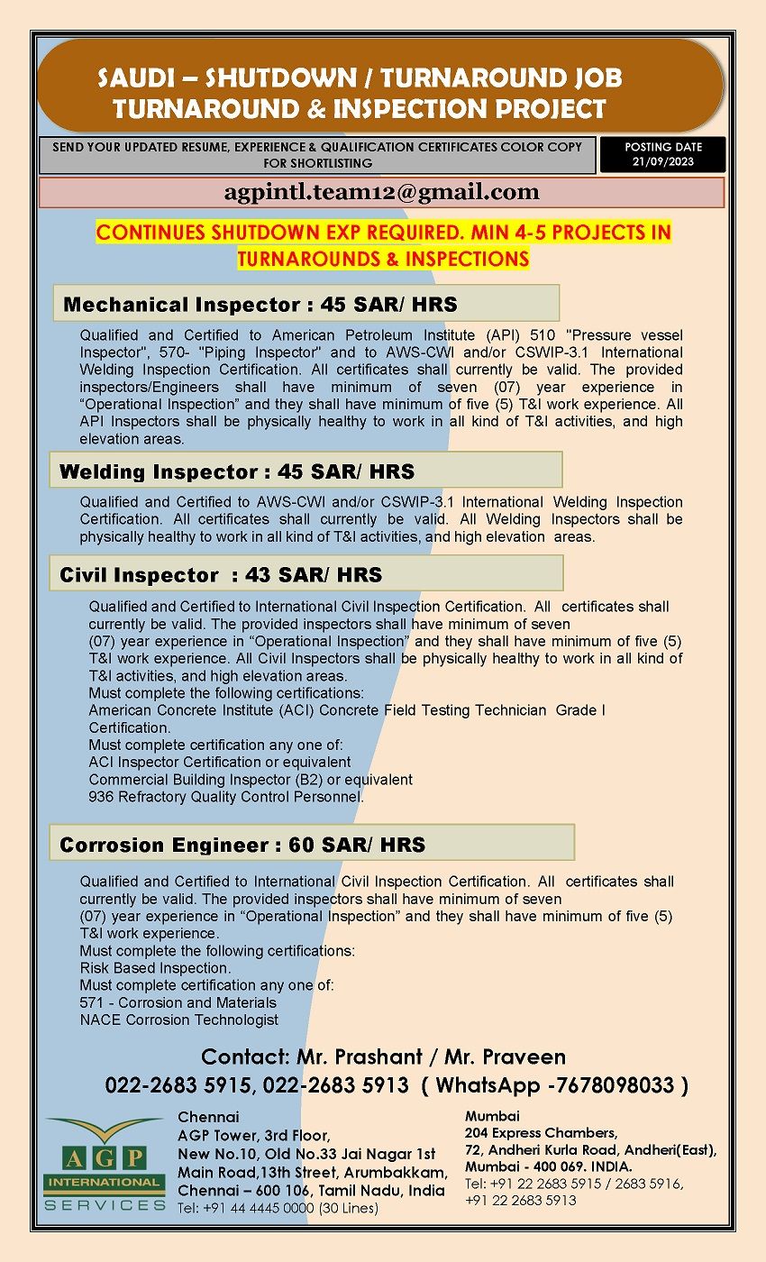 CONTINUES SHUTDOWN EXP REQUIRED. MIN 4-5 PROJECTS IN TURNAROUNDS & INSPECTIONS