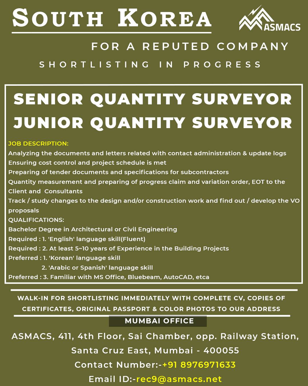 Required : 2. At least 5~10 years of Experience in the Building Projects