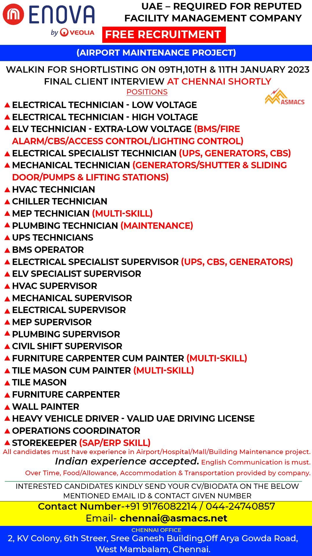 All candidates must have experience in Airport/Hospital/Mall/Building Maintenance project.
