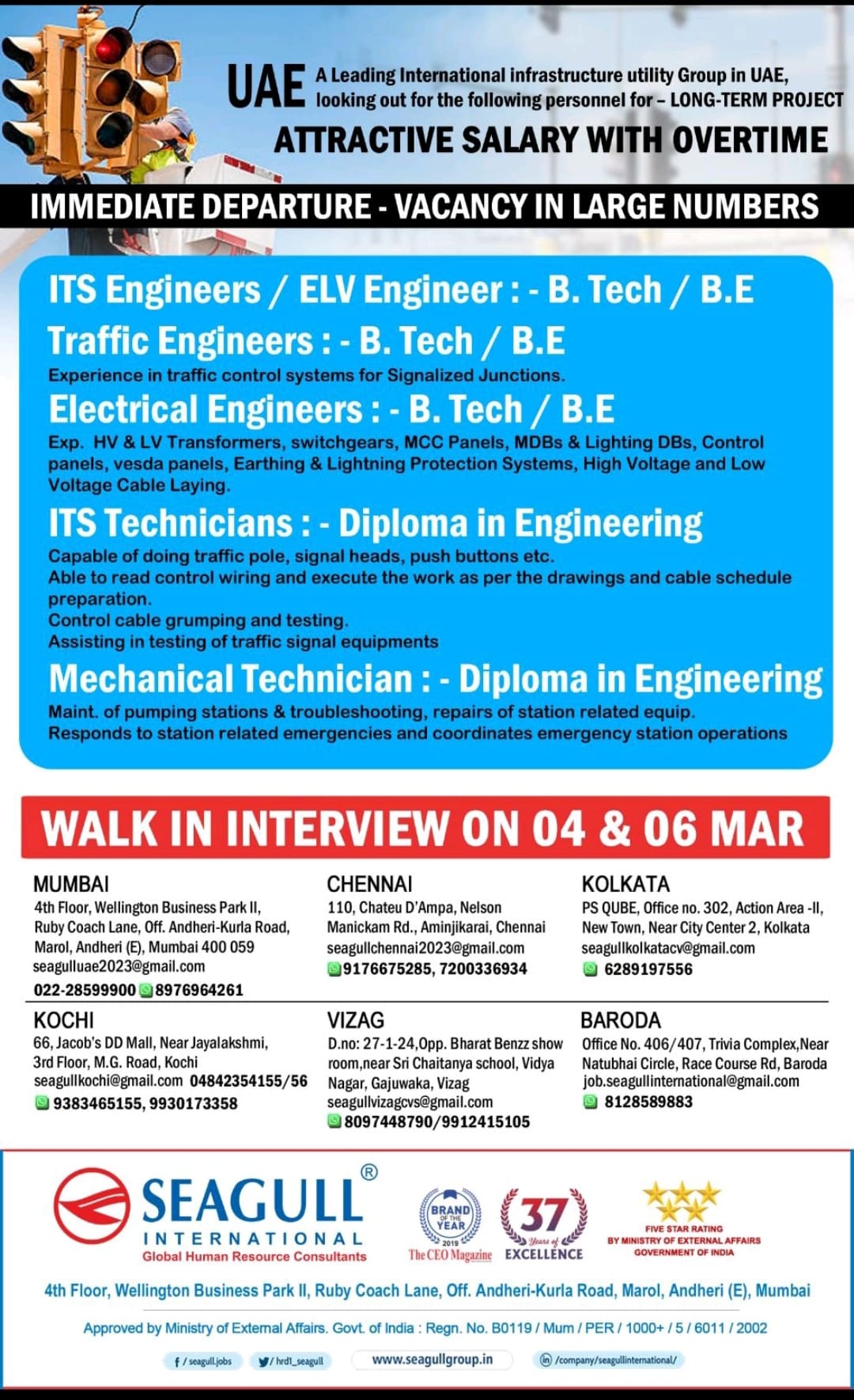ITS Engineers / ELV Engineer: – B.Tech/ B.E Traffic Engineers: – B. Tech / B.E