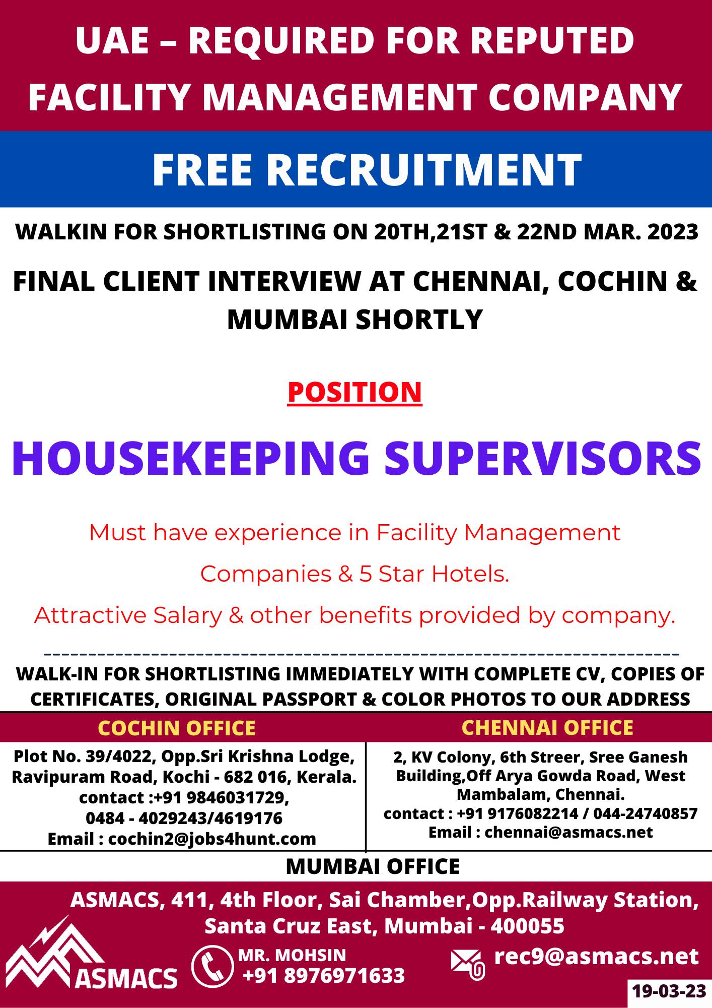 Must have experience in Facility Management Companies & 5 Star Hotels.