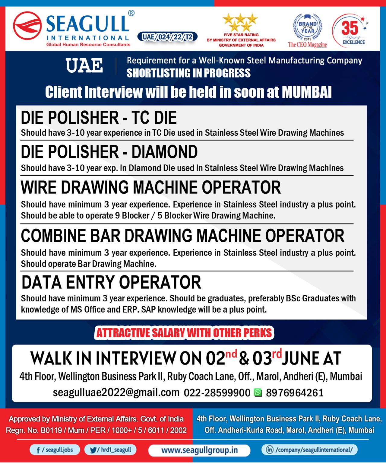 Should have 3-10 year exp. in Diamond Die used in Stainless Steel Wire Drawing Machines