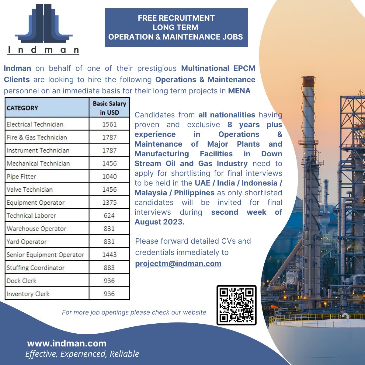 Indman on behalf of one of their prestigious Multinational EPCM Clients are looking to hire the following Operations & Maintenance personnel on an immediate basis for their long term projects in MENA.