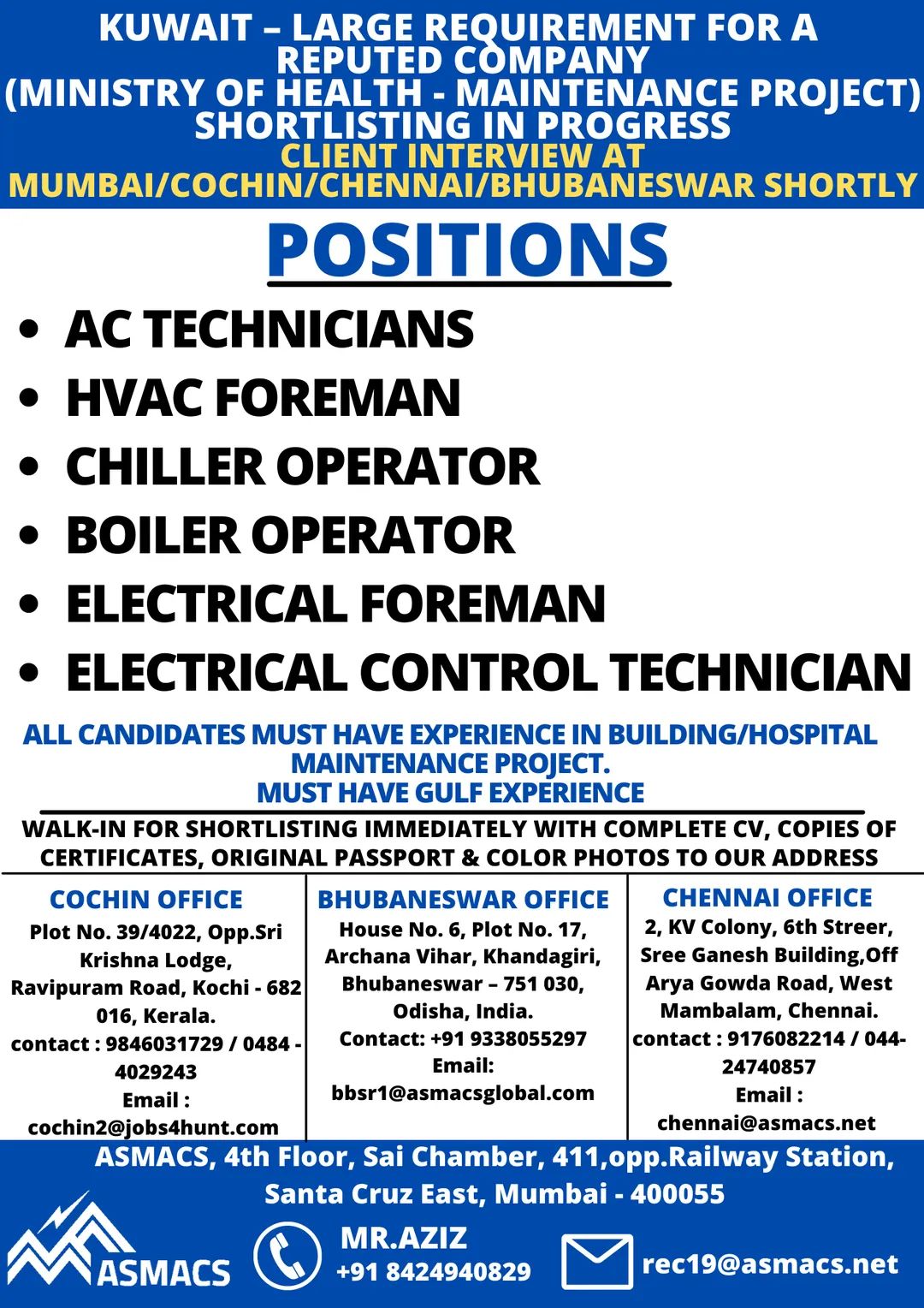 • CHILLER OPERATOR • BOILER OPERATOR • ELECTRICAL FOREMAN • ELECTRICAL CONTROL TECHNICIAN
