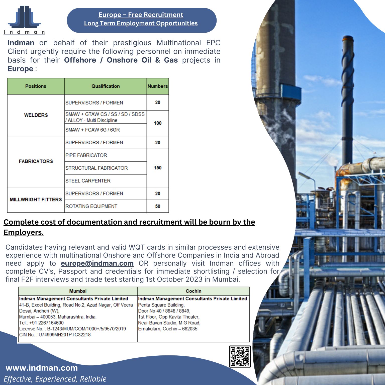 with multinational Onshore and Offshore Companies in India and Abroad need apply to europe@indman.com