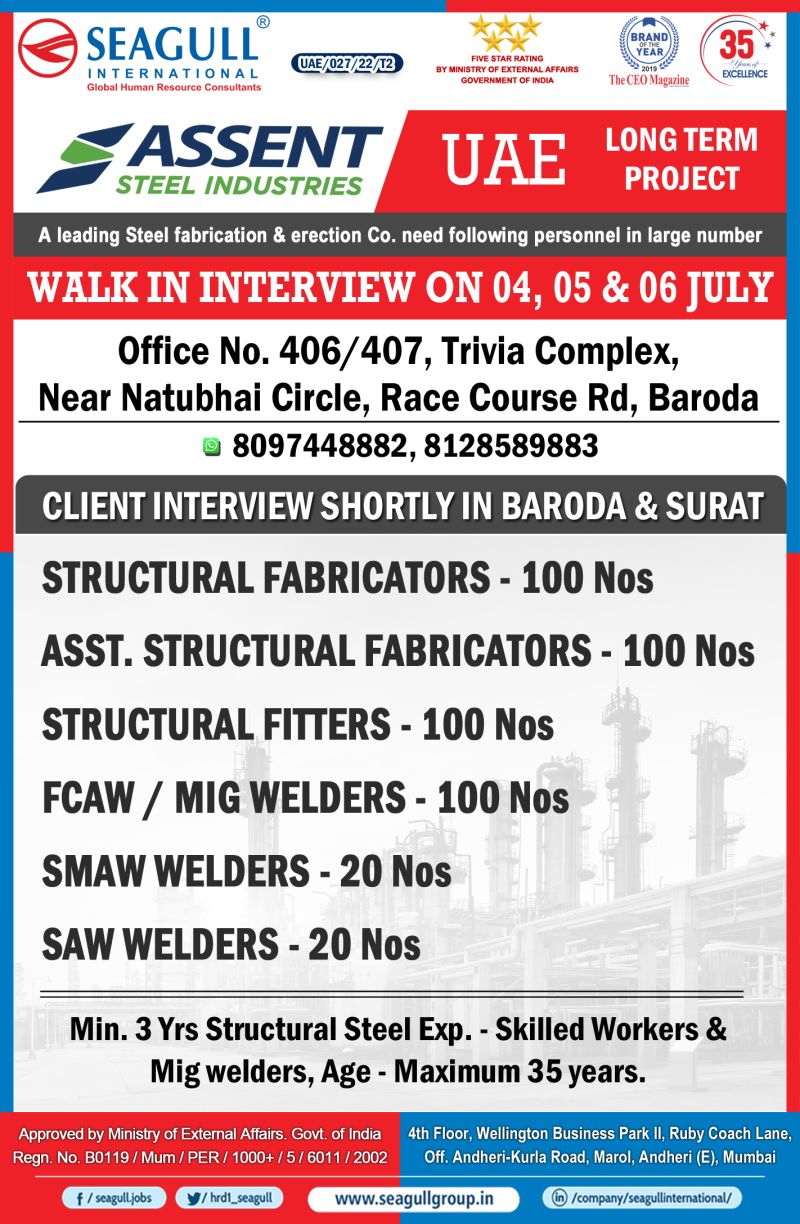 Min. 3 Yrs Structural Steel Exp. – Skilled Workers &