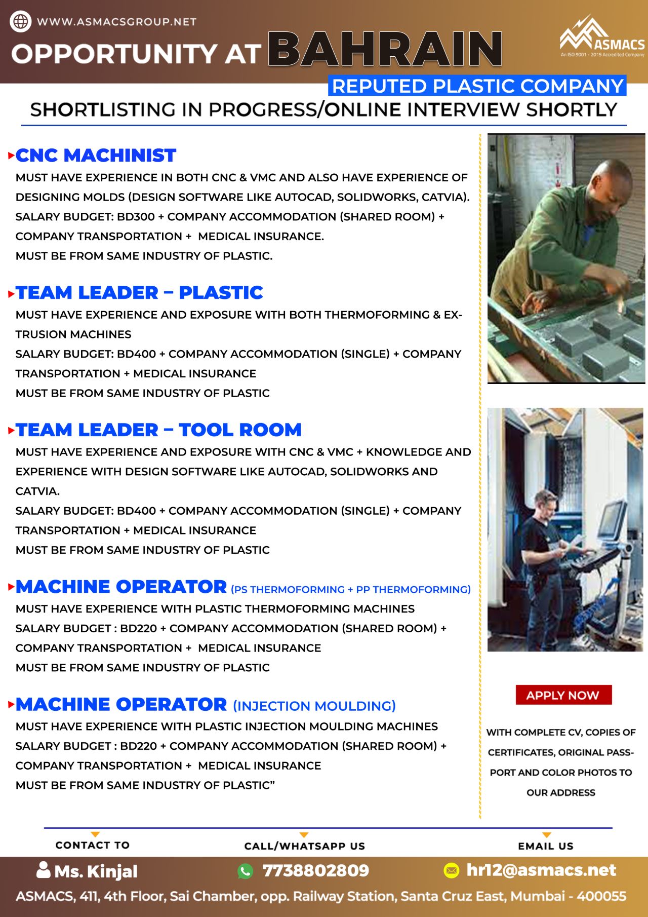 MUST HAVE EXPERIENCE WITH PLASTIC INJECTION MOULDING MACHINES