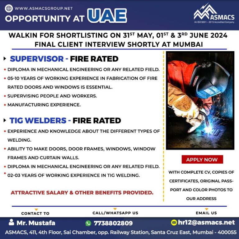 OPPORTUNITY AT UAEASMACSAn ISO 9001-2015 Accredited CompanyWALKIN FOR SHORTLISTING ON 31ST MAY, 01ST & 3RD JUNE 2024FINAL CLIENT INTERVIEW SHORTLY …