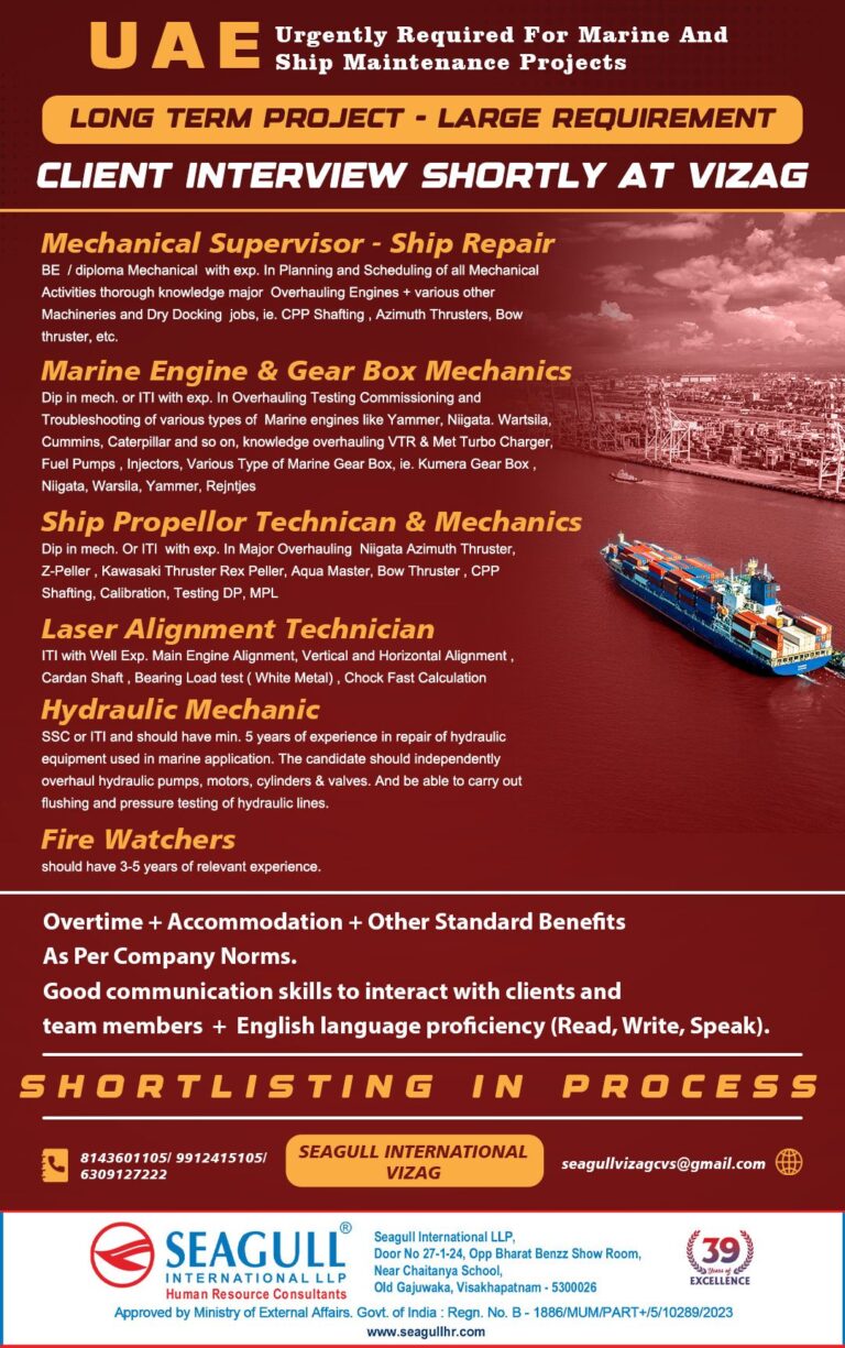 UAE Urgently Required For Marine AndShip Maintenance ProjectsLONG TERM PROJECT – LARGE REQUIREMENTCLIENT INTERVIEW SHORTLY AT VIZAGMechanical Supervisor – Ship …