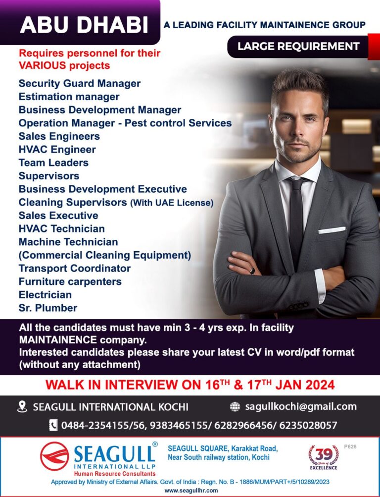ABU DHABI A LEADING FACILITY MAINTAINENCE GROUPLARGE REQUIREMENTRequires personnel for theirVARIOUS projectsSecurity Guard ManagerEstimation managerBusiness Development ManagerOperation Manager – Pest …