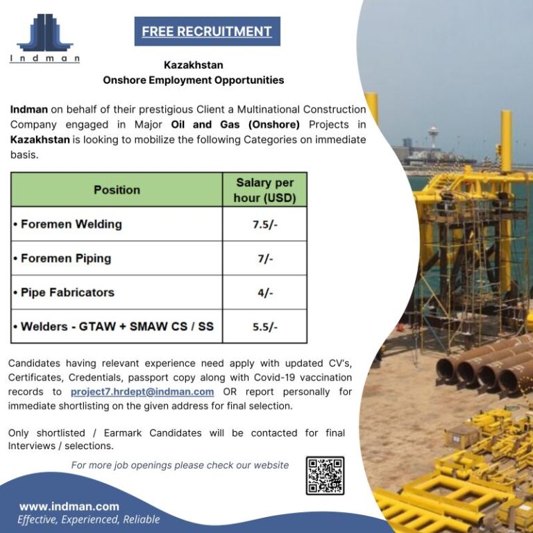 Kazakhstan Onshore Employment Opportunities Indman on behalf of their prestigious Client a Multinational Construction Company engaged in Major Oil and Gas (Onshore) …