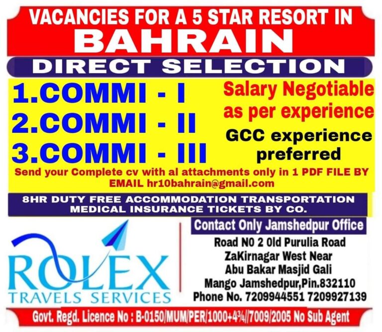VACANCIES FOR A 5 STAR RESORT IN BAHRAINDIRECT SELECTIONSalary NegotiableI-COMMI –as per experience2.COMMl – IIGCC experience3BCOMMl IllpreferredSend your Complete cv …