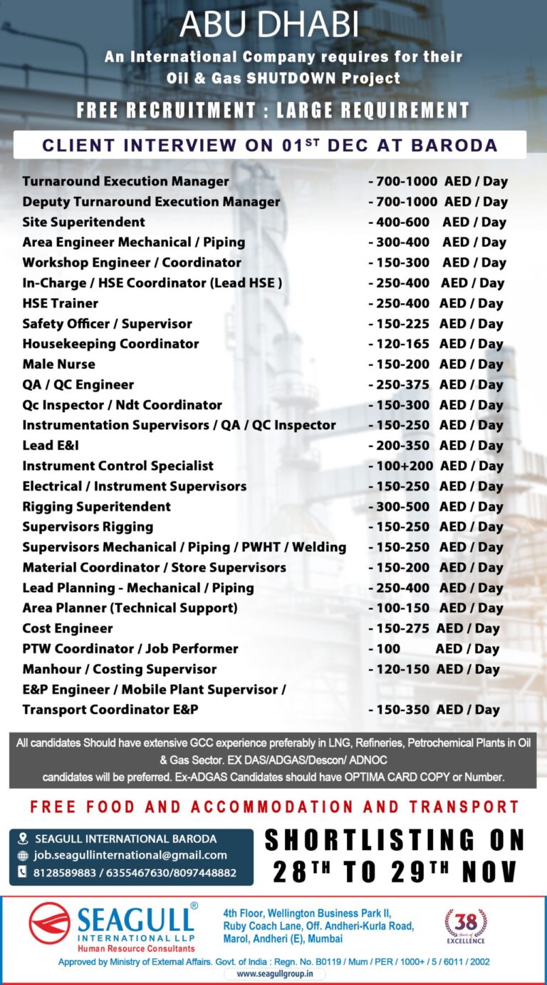 ABU DHABIAn International Company requires for theirOil & Gas SHUTDOWN ProjectFREE RECRUITMENT LARGE REQUIREMENTCLIENT INTERVIEW ON 01ST DEC AT BARODATurnaround …
