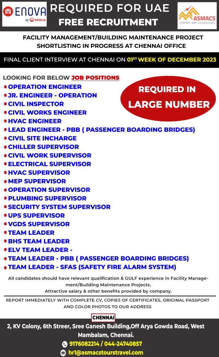 ENOVA REQUIRED FOR UAEby VEOLIAFREE RECRUITMENTASMACSAn 150 9001-2015 Accredited CompanyFACILITY MANAGEMENT/BUILDINGSHORTLISTING IN PROGRESS AT CHENNAI OFFICEMAINTENANCE PROJECTFINAL CLIENT INTERVIEW AT …