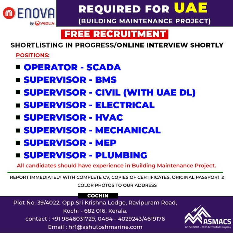 REQUIRED FOR UAE(BUILDING MAINTENANCE PROJECT)FREE RECRUITMENTIN PROGRESS/ONLINE INTERVIEW SHORTLY■ OPERATOR■ SUPERVISOR■ SUPERVISOR■ SUPERVISOR – ELECTRICAL