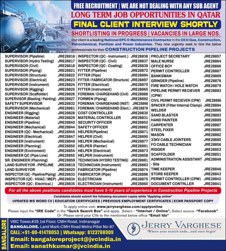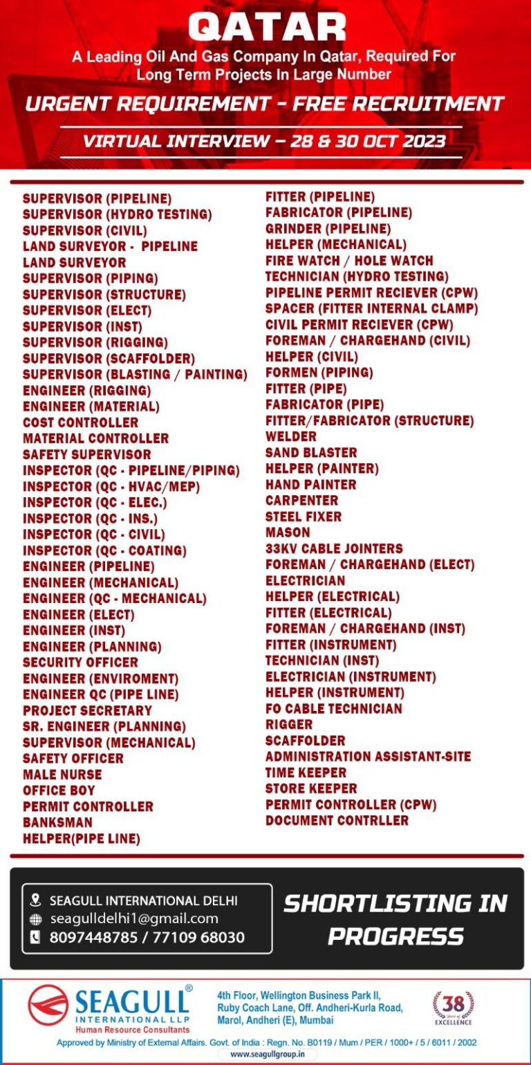 QATARA Leading Oil And Gas Company In Qatar, Required ForLong Term Projects In Large NumberURGENT REQUIREMENT – FREE RECRUITMENTVIRTUAL INTERVIEW …
