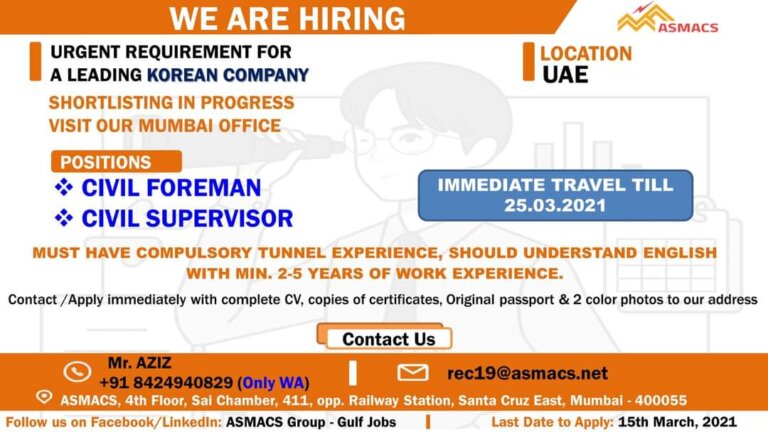 URGENT REQUIREMENT FORA LEADING KOREAN COMPANYSHORTLISTING IN PROGRESSVISIT OUR MUMBAI OFFICEPOSITIONSCIVIL FOREMANCIVIL SUPERVISORASMACSLOCATIONUAEIMMEDIATE TRAVEL TILL25.03.2021MUST HAVE COMPULSORY TUNNEL EXPERIENCE, SHOULD …
