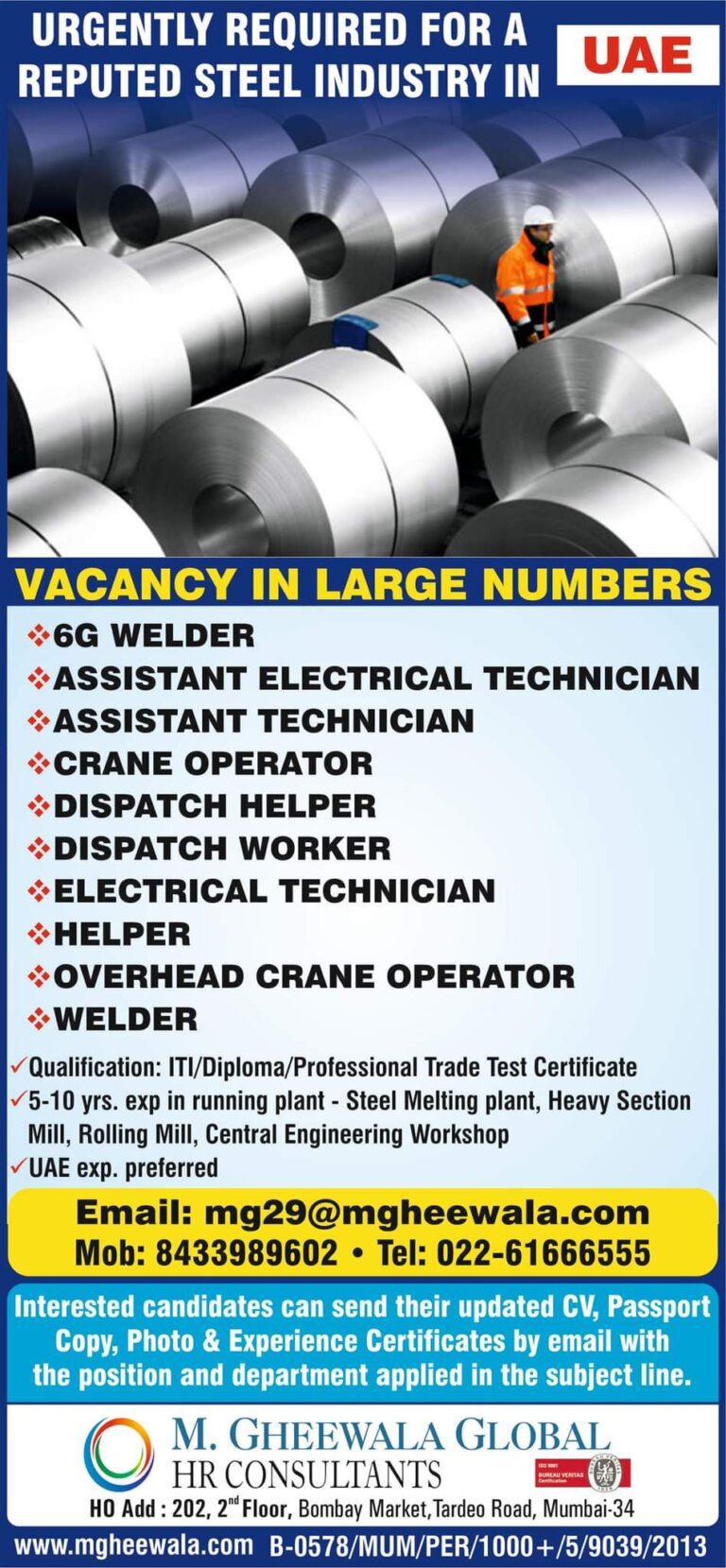 URGENTLY REQUIRED FOR AUAEREPUTED STEEL INDUSTRY INVACANCY IN LARGE NUMBERS6G WELDERASSISTANT ELECTRICAL TECHNICIANASSISTANT TECHNICIANCRANE OPERATORDISPATCH HELPERDISPATCH WORKERELECTRICAL TECHNICIANHELPEROVERHEAD CRANE OPERATORWELDERQualification: …