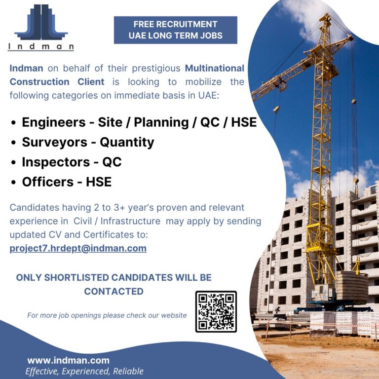Indman on behalf of their prestigious Multinational Construction Client is looking to mobilize the following categories on immediate basis in …