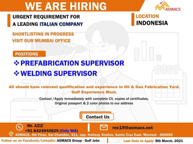 WE ARE HIRINGASMACSLOCATIONURGENT REQUIREMENT FORINDONESIAA LEADING ITALIAN COMPANYSHORTLISTING IN PROGRESSVISIT OUR MUMBAI OFFICEPOSITIONSPREFABRICATION SUPERVISORWELDING SUPERVISORAll should have relevant qualification and …