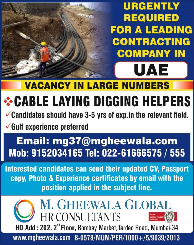 URGENTLY REQUIRED FOR A LEADINGCONTRACTING COMPANY INVACANCY IN LARGE NUMBERSCABLE LAYING DIGGING HELPERSCandidates should have 3-5 yrs of exp.in the …