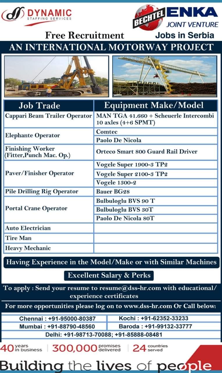 Jobs in SerbiaAN INTERNATIONAL MOTORWAY PROJECTJob TradeCappari Beam Trailer OperatorElephante OperatorFinishing Worker(Fitter,Punch Mac. Op.)Paver/ Finisher OperatorPile Drilling Rig OperatorPortal Crane …