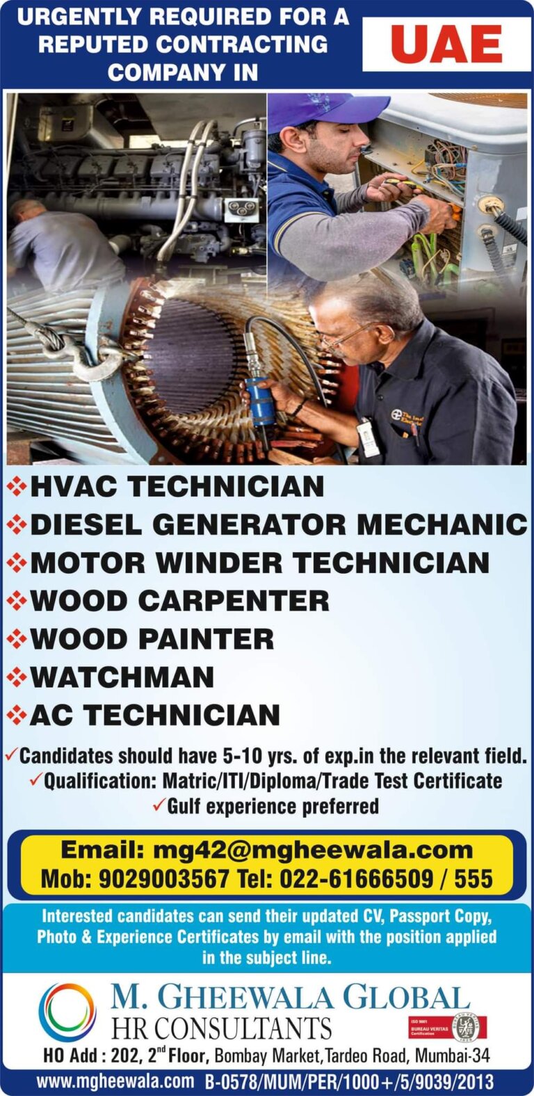 URGENTLY REQUIRED FOR AREPUTED CONTRACTINGCOMPANY INHVAC TECHNICIANUAEDIESEL GENERATOR MECHANICIMOTOR WINDER TECHNICIANWOOD CARPENTERWOOD PAINTERWATCHMANAC TECHNICIANCandidates should have 5-10 yrs. of exp.in …