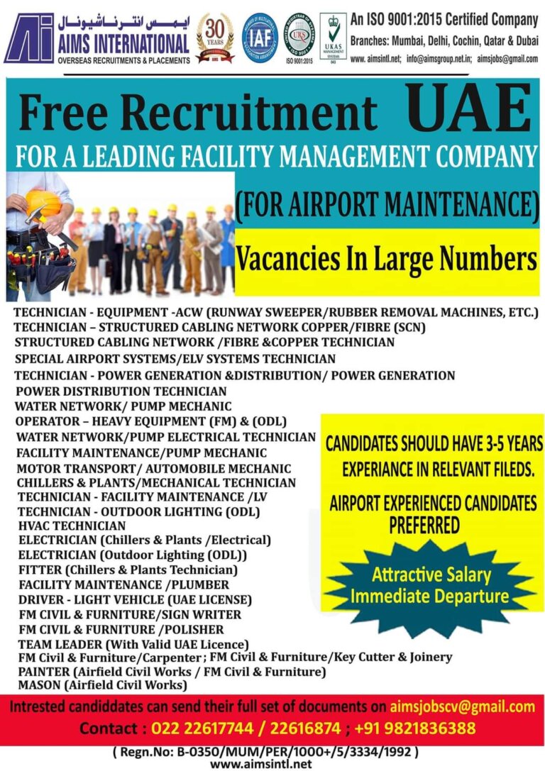 FOR A LEADING FACILITY MANAGEMENT COMPANYFOR AIRPORT MAINTENANCEVacancies In Large NumbersTECHNICIAN – EQUIPMENT -ACW (RUNWAY SWEEPER/RUBBER REMOVAL MACHINES, ETC.)TECHNICIAN – …