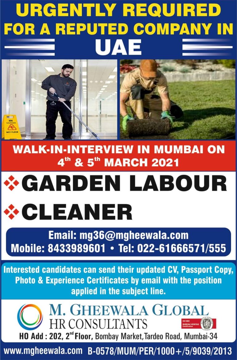 URGENTLY REQUIREDFOR A REPUTED COMPANY INWALK-IN-INTERVIEW IN MUMBAI ON4th & 5th MARCH 2021GARDEN LABOURCLEANEREmail: mg36@mgheewaIa.comMobile: 8433989601 • Tel: 022-61666571/555nterested candidates …