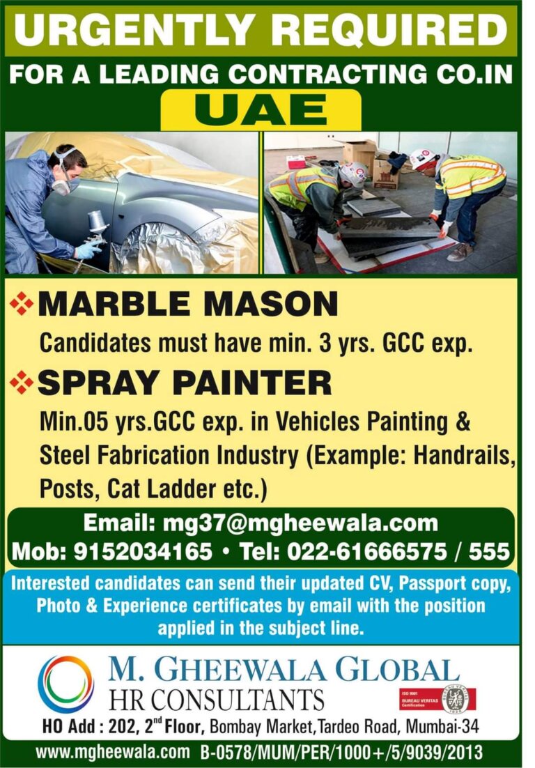 URGENTLY REQUIREDFOR A LEADING CONTRACTING CO.IN UAEMARBLE MASONCandidates must have min. 3 yrs. GCC exp.SPRAY PAINTERMin.05 yrs.GCC exp. in Vehicles …